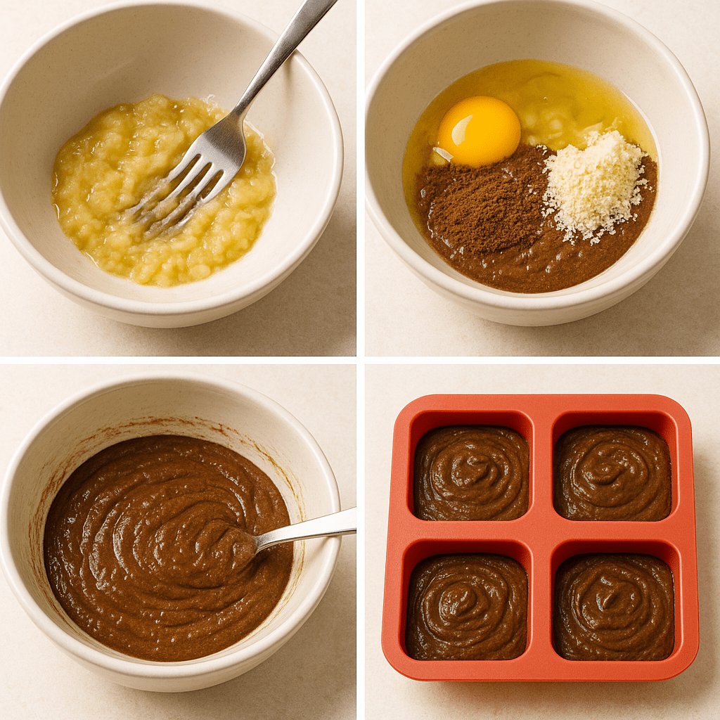 바나나를 포크로 으깨고 계란을 넣어 섞습니다. - Add cocoa powder, almond flour, and baking powder. Mix until smooth.